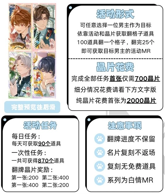 《未定事件簿》的“指尖语与甜心谣”是一个限时翻格子赢取男主限定卡的活动。活动期间,玩家可以挑选心仪的男主作为目标,通过翻格子的方式获取奖励。当翻完25个格子后,还能解锁活动限定的MR奖励。活动时间为3月10日至17日,玩法十分简单,只需积攒道具、翻格子,就能拿到颜值高又甜蜜的男主卡牌,下面一起来看看具体的活动分析吧!