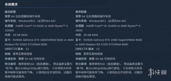 附注事项:建议使用SSD(固态硬盘)。当预设画质设置为“低”时,游戏可在1080p分辨率、30fps帧率下运行。※在负荷较高的场景中,帧率可能会出现下降。※由于游戏尚处于开发阶段,所记载的规格存在更改的可能性。