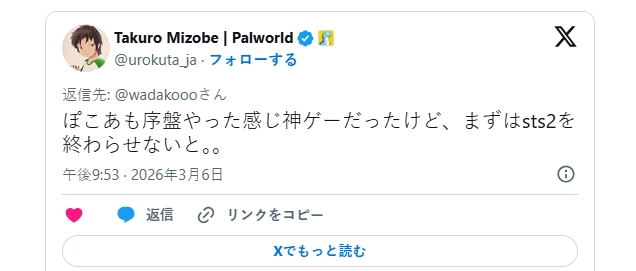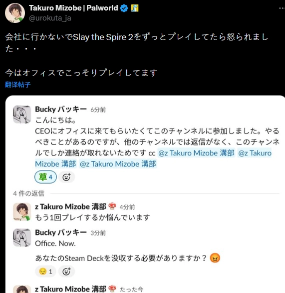 《幻兽帕鲁》的社长沟部拓郎对《杀戮尖塔2》赞不绝口,称其为“神游戏”。他透露自己曾和同事约好要开公司会议,却因沉迷这款游戏而不想去,最后同事只能跑到他的X账号下留言提醒该工作了。同事也很清楚老板已经深陷游戏,还开玩笑问要不要没收他的Steam Deck来阻止他继续沉迷。