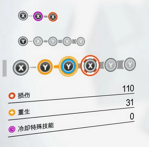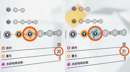 蓝色双倍奖励的图标,第二个键位同样是Y,不过蓝色按键能带来额外的重生奖励。需要注意的是,蓝色按键仅提升属性,不会增加损伤,只有当键位是红色重击时才会有奖励,这条规则对紫色技能也同样适用。