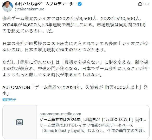 中村平指出,即便面对相似的成本压力,日本企业裁员现象看似较少,实则是受雇佣法规的限制。由于难以解雇员工,企业便从源头减少招聘。当前日本游戏企业的应届生招聘名额持续减少,社会招聘的机会也在不断缩减,他坦言未来进入日本游戏公司的难度可能会比现在更大。