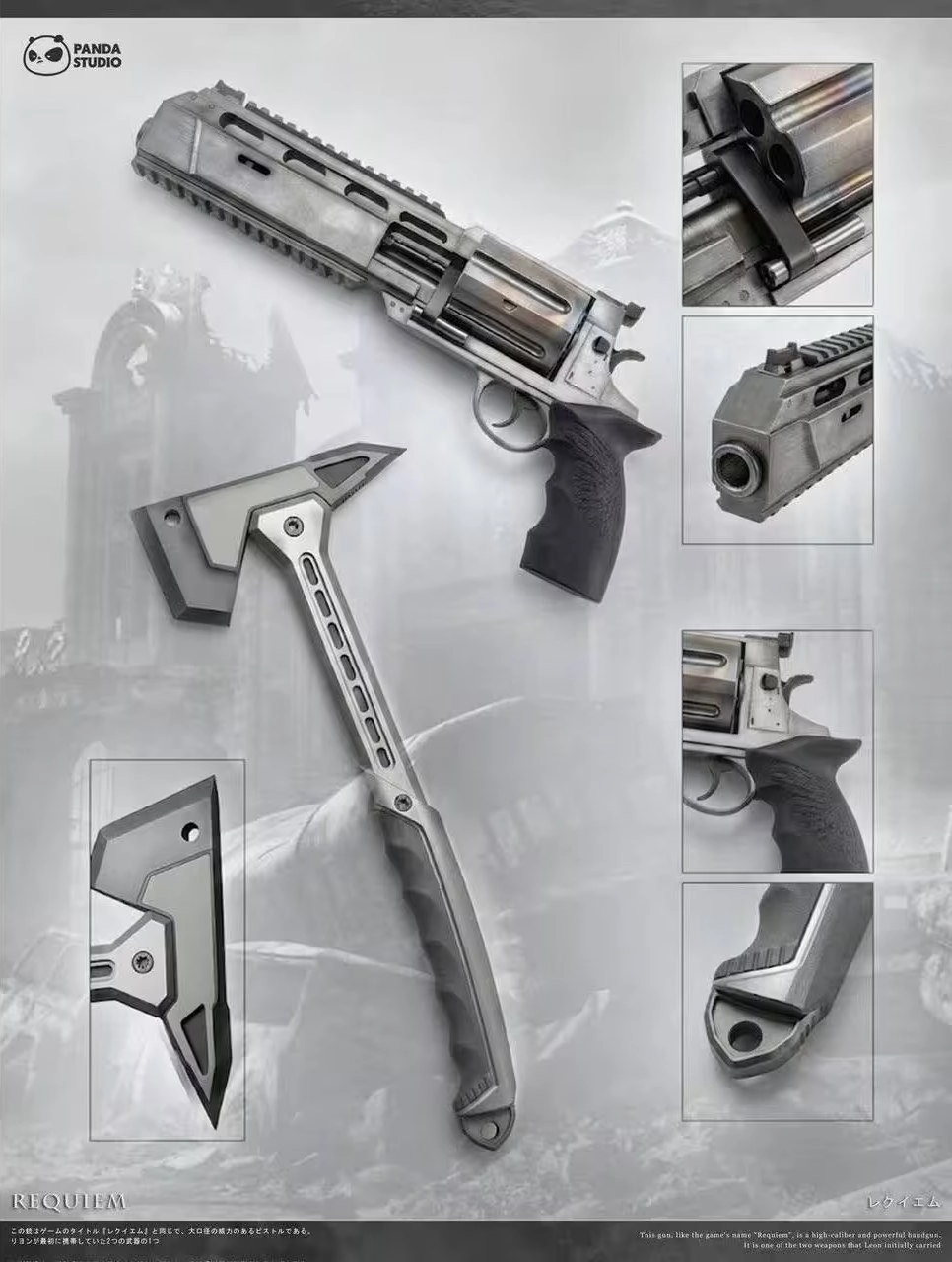 Panda Studio 正式发布《生化危机:安魂曲》主题非官方收藏套装,其中包含“安魂曲”转轮手枪与战术斧的1:1实物复刻模型。这两件道具均采用仿真做旧金属工艺,结合细致还原的废墟场景底座,生动呈现出浣熊市的末世景象。