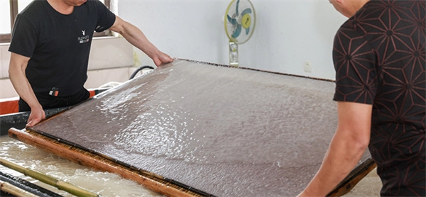 “捞纸”是宣纸制作里至关重要的传统工艺之一,具体是指工匠手持竹帘,在纸浆池中反复荡动以匀开纸浆,让纤维均匀排布后“捞”起形成湿纸的过程。这一环节直接影响着纸张的厚薄程度、均匀状态与纹理构造。精湛娴熟的技艺能让纸张纤维自然交错、质地柔韧,进而使宣纸具备出色的吸墨性能与耐久特性,是彰显传统手工造纸核心精髓的关键步骤。