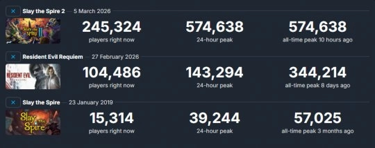 这表明《杀戮尖塔2》已然成为2026年开年至今首发在线人数最高的游戏,毫不费力地超越了热度极高的《生化危机9》(尽管后者是多平台游戏)。考虑到《GTA6》PC版大概率不会在今年推出,那么今年它或许就没有了竞争对手,目前还想不到哪款游戏能打破它在Steam上的首发记录。