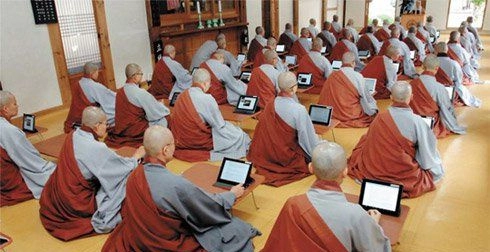 在韩国庆尚北道金泉市的青岩寺僧伽大学中,沙弥僧们正借助iPad进行听课学习。