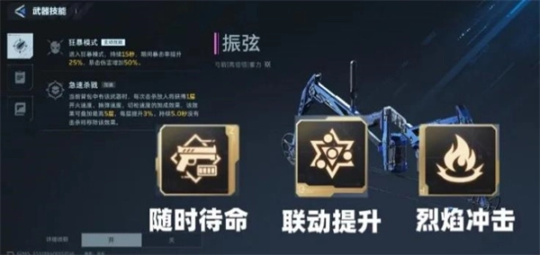 1、振弦堪称一把百搭武器,其主动技能可触发狂暴模式,持续15秒,期间暴击率提升25%、暴击伤害增加50%!搭配主武器技能与龙炎弹,能打出超额伤害,更快速秒杀BOSS!2号插件“随时待命”可使武器处于后台时,技能充能效率提升55%,助力更快开启技能以增加暴击率和暴击伤害!