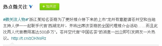 苍井空代言“中国名茶”的消息发布后,迅速在网络上引发广泛讨论,网友们的看法呈现出明显的两极分化。有网友如“摩西斯”认为:“中国的茶友有福气了,以后喝茶时能看到苍井空,这是多么惬意的休闲方式啊……”不过,在相关微博的留言中,有近六成网友表达了反对和担忧的态度。他们普遍觉得,作为中国八大名茶之一,其蕴含着深厚的文化底蕴和历史渊源,如今却邀请苍井空代言,无论是从情感层面还是文化层面,都让人难以接受。与此同时,浙江的茶商也将目光投向了苍井空。昨日,某媒体通过微博爆料称:“浙江某知名茶商为了更好地推广即将上市的‘龙井’,有意邀请苍井空与当地主持人伊一一(微博)共同代言‘西湖龙井’,并且两人将出席该茶商的全国代理推介会活动……此外,此次两人的代言费用高达500多万元……”