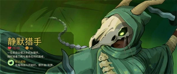 2、静默猎手:定位为敏捷型刺客,主打灵活输出。前作经典的毒流与小刀流均已全面重做,新增了大量过牌与爆发卡牌,并优化了循环逻辑,爽感十足,适合偏爱灵活操作、追求持续输出的玩家。特别是小刀流,在新加入的刀刃陷阱与刀扇助力下,成型后的一波爆发,能扛住的BOSS寥寥无几。此外,毒系与弃牌体系的强度也不容小觑,整体成型后的强度在所有角色中处于一线水准。该角色推荐有一定基础的玩家尝试,主要原因在于猎人的过渡成型阶段对萌新而言较难把控,很容易在一层和二层折戟。一层的幽灵鳗鱼群与旧日雕像极易将玩家打残,二层精英中存在小刀流最忌惮的蜂群术士,后续还有伪装成小怪的猎人杀手伺机而动,这都为成型增加了难度。