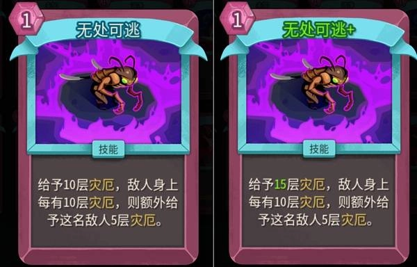 无处可逃:1费施加10点灾厄,升级后变为15点,特效保持不变。它的数值相当出色,特效也很强大——对带有30点灾厄的敌人使用时,其灾厄数值超过3费的“末日降临”;当灾厄叠加到50层时,“无处可逃+”的数值也优于“末日降临+”。在灾厄体系中,这张牌实用性拉满,不仅下限有稳定保障,上限更是极高,只要想玩灾厄体系就必拿。遇到第一张“无处可逃”时,除非旁边正好有“末日降临”且卡组里还没有“末日降临”,否则完全可以无脑选择。