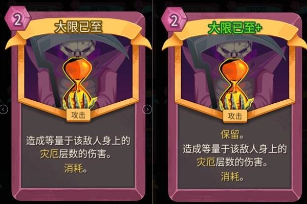 大限将至:2费造成等同于目标敌人灾厄层数的伤害,带有消耗词条,升级后会新增保留效果。这是物理流派的叠层上限卡牌,对于不选择“死神形态”的非物理灾厄流派而言,仅能作为高灾厄层数时的斩杀手段。虽然它的斩杀上限比“末日降临”更高,但仍无法避开灾厄结算的问题,所以还是需要搭配生存类卡牌使用。