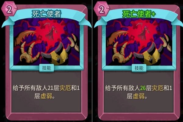 死亡使者:2费21灾厄1虚弱,升级26灾厄1虚弱。数值正常,虚弱配合叠甲or召唤增加生存,但是2费和3费的“末日降临”很难在没有加费的情况同时使用。