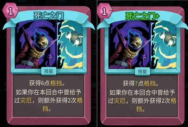 死亡之门:消耗1点费用可叠加6点护甲,若本回合曾对自身施加灾厄效果,则额外获得2次叠甲机会;升级后每次叠甲数值提升至7点。其触发条件为消耗1费叠加18甲(升级后为21甲),且叠甲效率是敏捷属性的3倍,是灾厄流派中唯一核心的叠甲手段。尤其当拿到“精神过载”时,由于每回合会固定给自己施加灾厄,可直接无条件触发3倍叠甲效果,堪称数值层面的强力存在。
