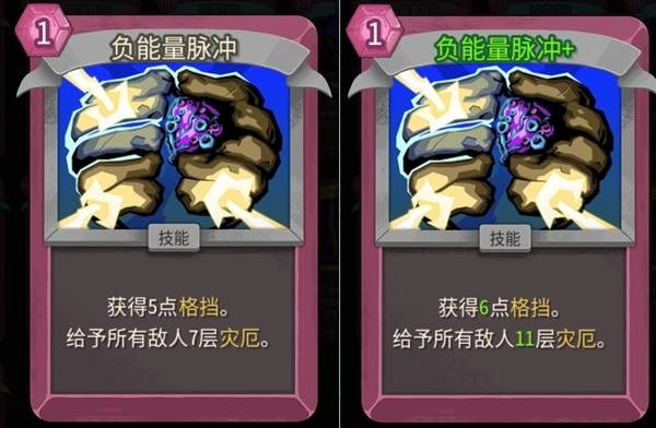 负能量脉冲:消耗1点费用,基础效果是叠加5点护甲并对群体造成7点灾厄伤害;升级后叠加6点护甲,群体灾厄伤害提升至11点。前期阶段,它的数值表现较为普通,由于此时敌人血量通常不高,往往能直接攻击击杀,对群体灾厄的需求较低。不过,其同时具备叠甲和叠加灾厄的特性,与灾厄体系的核心机制高度契合。进入中期后,随着战斗节奏加快、敌人强度提升,它的性能优势逐渐显现,实际使用体验十分顺畅。前期若缺乏灾厄类卡牌,可考虑入手;中期即便已有其他灾厄牌,若有多余卡位,也值得纳入构筑。要是能在高叠甲的同时保持较低的灾厄层数(便于后续灾厄效果的叠加爆发),那它的作用将达到最大化。