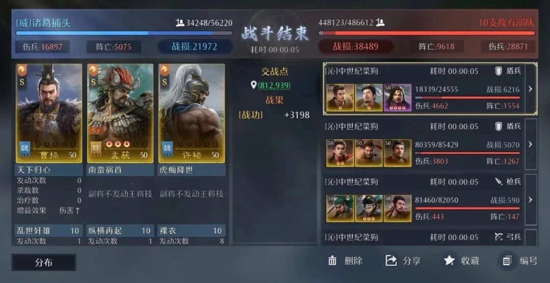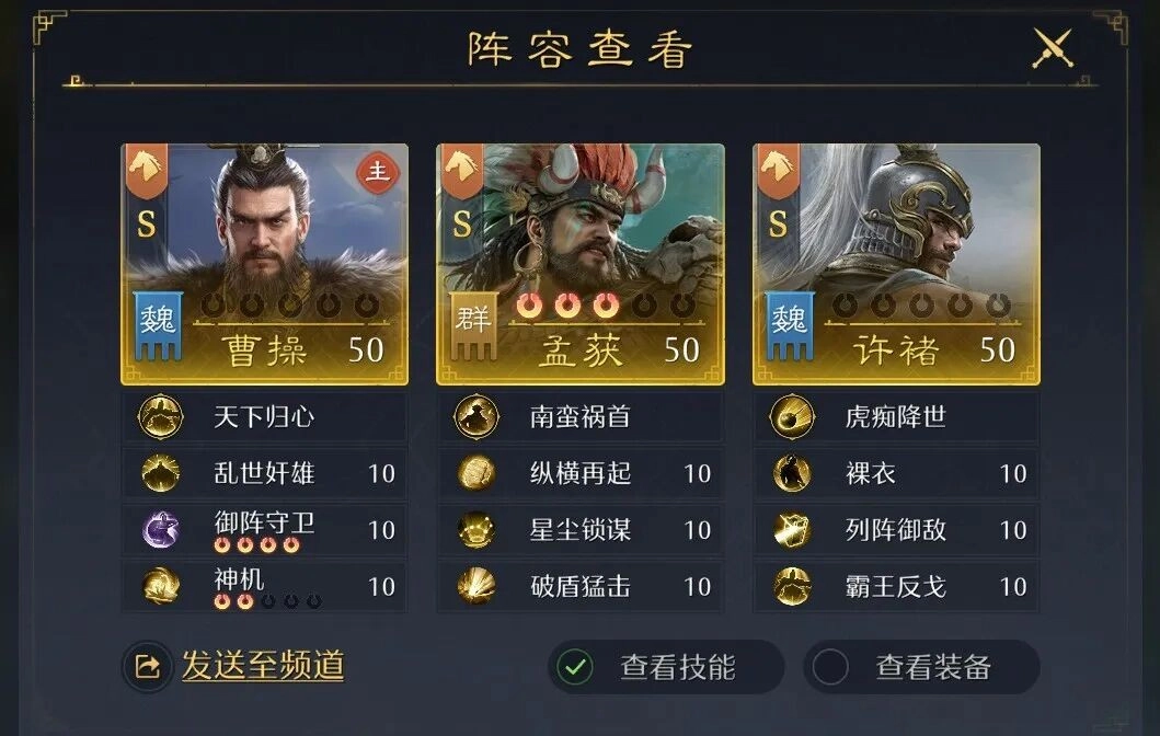 可以稍微调整一下表述,让孟获“红一点”的感觉更明显,同时保持原意:孟获最好能稍微红一点(比如带点输出或功能性红度)。选择许褚而非典韦,主要是因为他的固定技能能触发碎甲效果,与破盾猛击、霸王反戈形成良好的联动。曹操的话,建议携带坚阵合一,再搭配智力型指挥技能,比如神机、挫其将威这类。另外要特别注意,战场持续时间最好别超过11秒,不然会很吃亏。