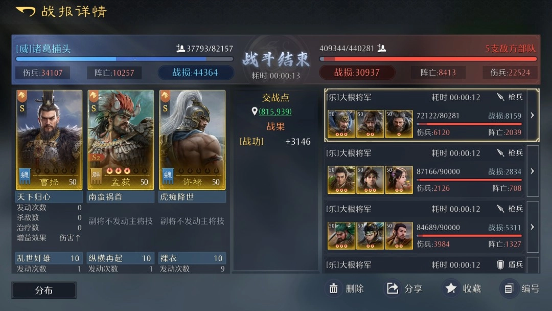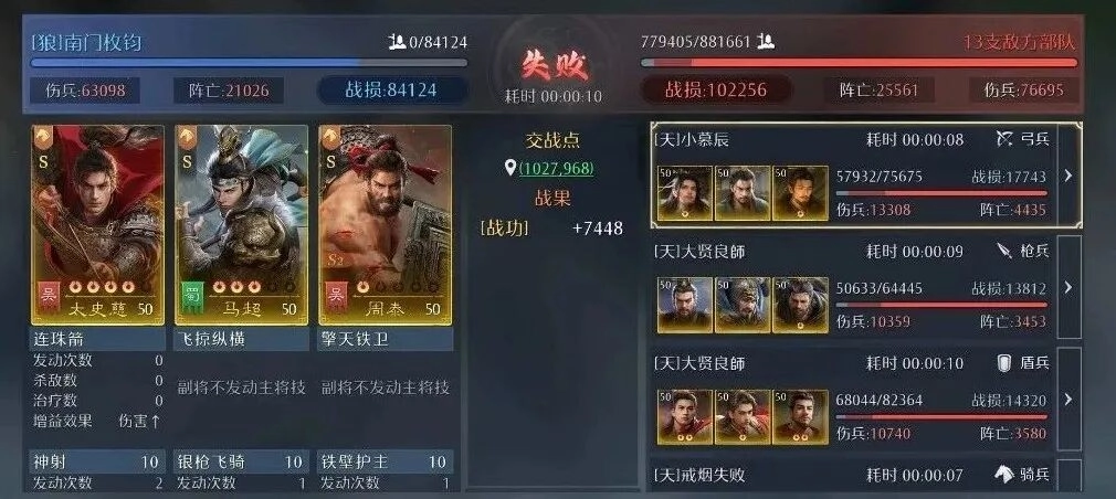 通过战报可以看到,我方在被对方13队集火的情况下,仍取得了7400战功,我方战损84000,对方战损102000;单次进攻能造成1500伤害,我方战损5800,对方战损2400。由此建议高红或满红玩家尝试,该玩法需要较多使用突击技能。