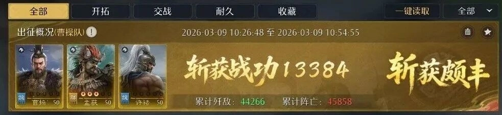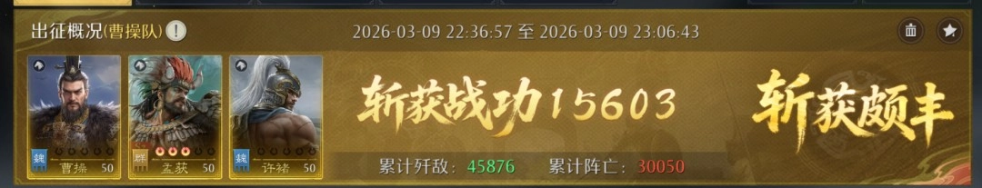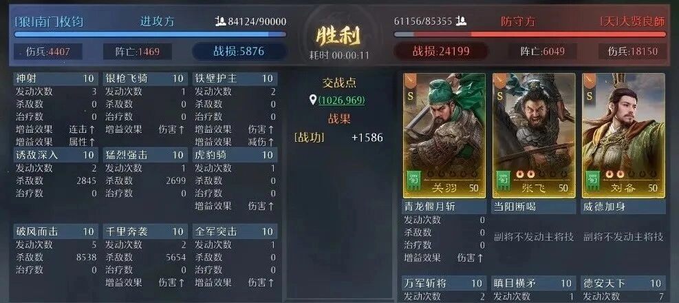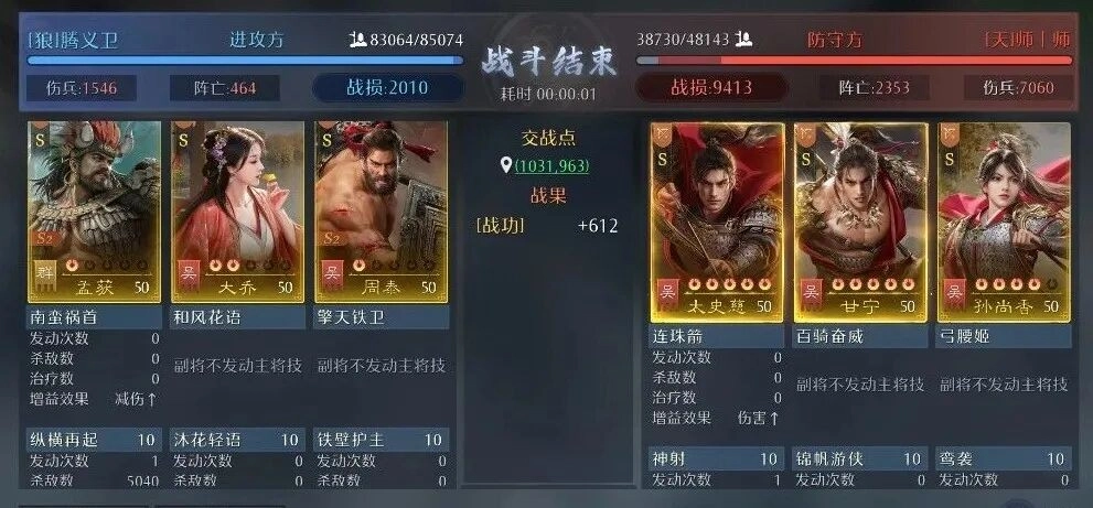 通过战报观察到,对阵满红溃逃弓时,每秒可获取600战功,对方战损达9400,我方战损仅2000。孟获、大乔、周泰这组搭配建议至少点红使用,白板状态下输出会稍显不足。