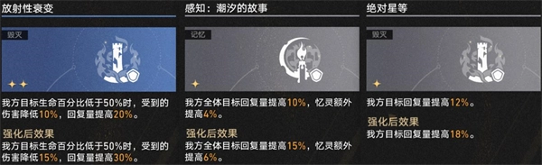 4、在增伤补强方程的适配性上,遐蝶能够享受到诸多通用增伤方程的加成。二星方程里,流星批发商能为死龙带来稳定的真实伤害增益;彗星调教师可提供暴击伤害加成;园艺师能增加额外的附加伤害;星空寓言家能够提供易伤效果加成;转职轮盘则可以提升全队速度,进而提高风堇的治疗效率,加速队伍的循环节奏。一星方程方面,遐蝶也能有效触发并获取各类提供通用伤害加成、忆灵伤害加成、耀变伤害加成、暴击率以及抗性穿透的方程所带来的增益。