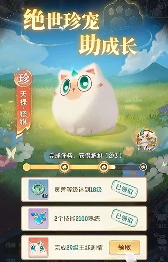 在《灵兽大冒险》里获取貔貅的方法十分简单。玩家刚进入游戏时,会解锁一个叫“绝世珍宠助成长”的活动。该活动共分为三个阶段,玩家完成所有阶段的任务后,即可免费获得貔貅。这些任务大多能随着主线剧情的推进自动完成,不会让玩家陷入卡关的困境。