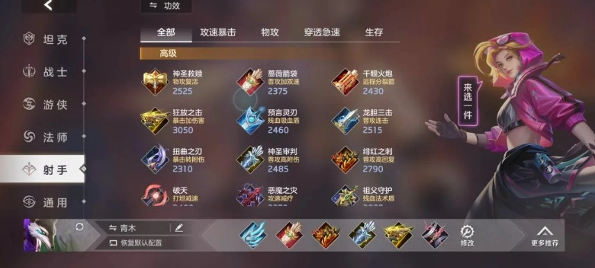 在出装选择上,刀锋之翼能为前期提供攻速与普攻伤害加成,让对线阶段更稳定;蔷薇箭袋兼具攻击速度与移动速度的双重加成,是几乎必选的装备;神圣审判可使普攻附带额外伤害,同时也有攻速提升效果;狂放之力是较为关键的装备,但需注意不要与扭曲之刃同时出,两者叠加会导致效果打折扣。最后一个装备栏可根据局势选择平衡支配者或破天,若有保命需求,也可以考虑换成绯红之刺。
