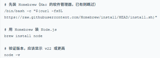 OpenClaw 基于 Node.js 运行,必须先装好它,而且版本必须是 v22 或更高,低版本会导致启动失败。