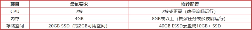 2、内存:最低要求为 4GB,推荐8GB或以上,特别是运行复杂任务或多技能时。