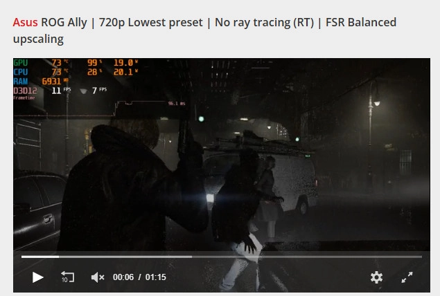 ROG Ally在720P最低预设画质下,即使开启了FSR平衡模式,也只能跑到11帧。