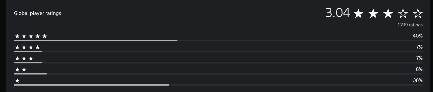 目前《马拉松》在全球PSN平台上累计收获了超过13119条用户评价。其中,给出5星好评的用户占比达40%,而给出1星差评的用户占比也接近这一比例,为38%。