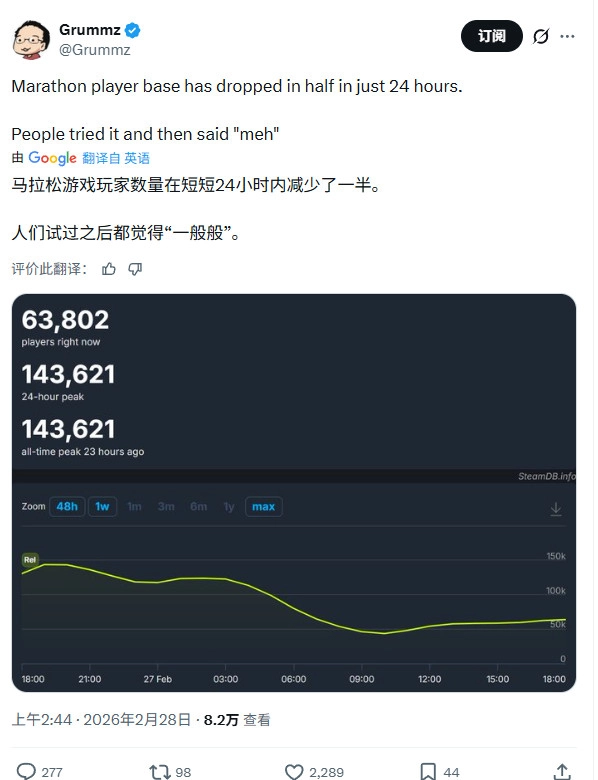 《马拉松》开启测试仅一天,Steam在线玩家数量便减少了一半。