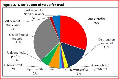 如图2所示,成本构成中占比最大的两项是原材料与苹果自身的利润率。虽然iPad的组装环节是在国内完成的,但劳动力成本的占比依然很低,仅为总成本的2%左右。