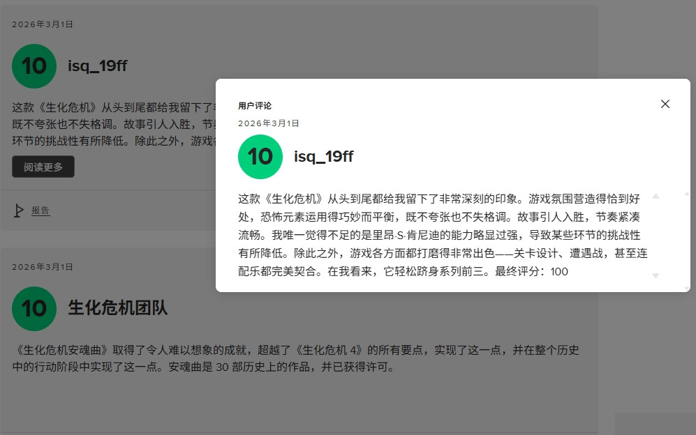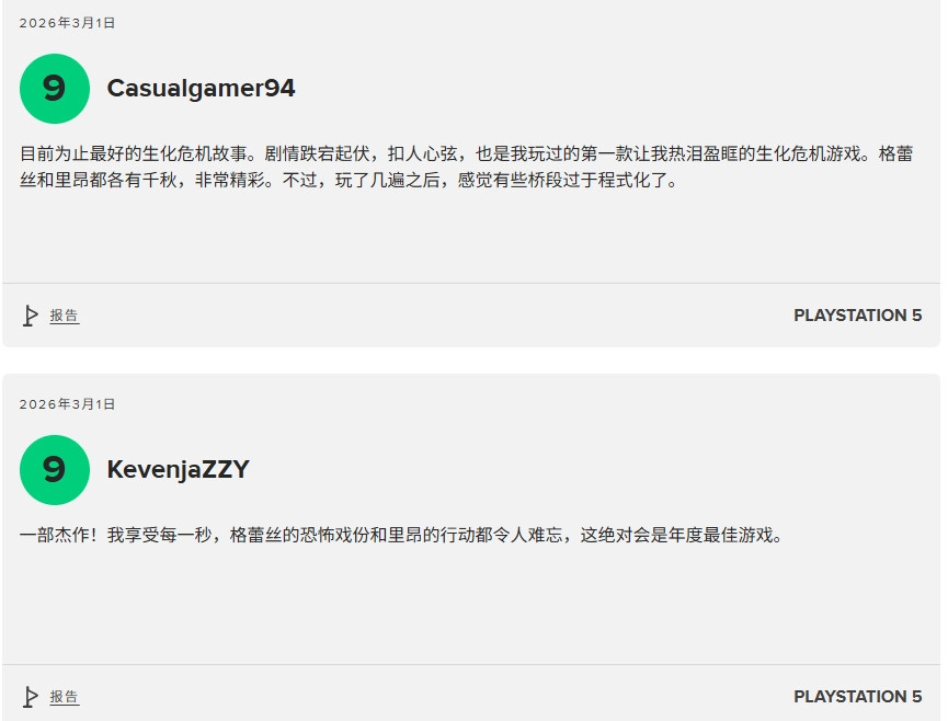 在Metacritic平台上,《生化危机9:安魂曲》的PS5版本收获了9.5分的用户评分,这一成绩不仅超越了系列此前所有作品,连《生化危机4》原版及其重制版也被其甩在身后。而在此之前,该系列的用户评分纪录由2005年推出的《生化危机4》保持,当时它的用户评分是9.1分。
