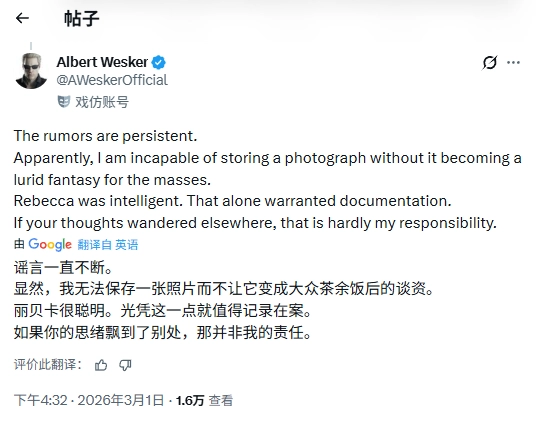 这一细节曝光后很快在玩家群体中激起热烈讨论。在评论区里,有位模仿威斯克的推特用户借梗调侃道:“相关的传闻始终没断过。很明显,在旁人眼里,我好像连保存一张照片都做不到,总会让它沦为大家口中的低俗臆想。瑞贝卡很聪慧,单是这一点,就值得被记下来。要是你往别的方向想了,那可跟我没关系。”