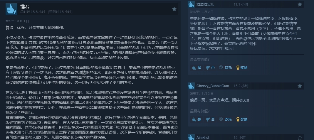 在剧情层面,玩家的评价呈现出明显的分化态势。多数评测对系列经典角色所承载的情怀价值给予了肯定,特别是围绕里昂展开的相关情节收获了较高的赞誉。然而,新主角格蕾丝的角色塑造却遭遇了一些质疑,部分评论指出其“缺乏清晰的成长脉络”“行动动机不够明确”。此外,整体剧情时长偏短的问题也被不少玩家反复提及。