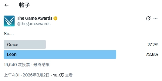 近日,TGA官方账号在社交媒体X上发起了一项投票,让玩家在《生化危机9:安魂曲》的两位主角里昂·S·肯尼迪和格蕾丝·阿什克罗夫特中选择其一。到目前为止,这个投票已经收到了超过1.96万份反馈,结果一目了然:里昂以72.8%的得票率遥遥领先,格蕾丝则只得到了27.2%的选票。