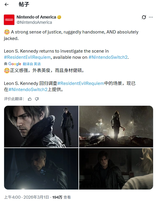 这段推文旨在宣传《生化危机9:安魂曲》登陆任天堂Switch 2平台。作为系列第九部正统续作,此前主角里昂·肯尼迪的回归消息已在玩家社群中掀起热烈讨论。
