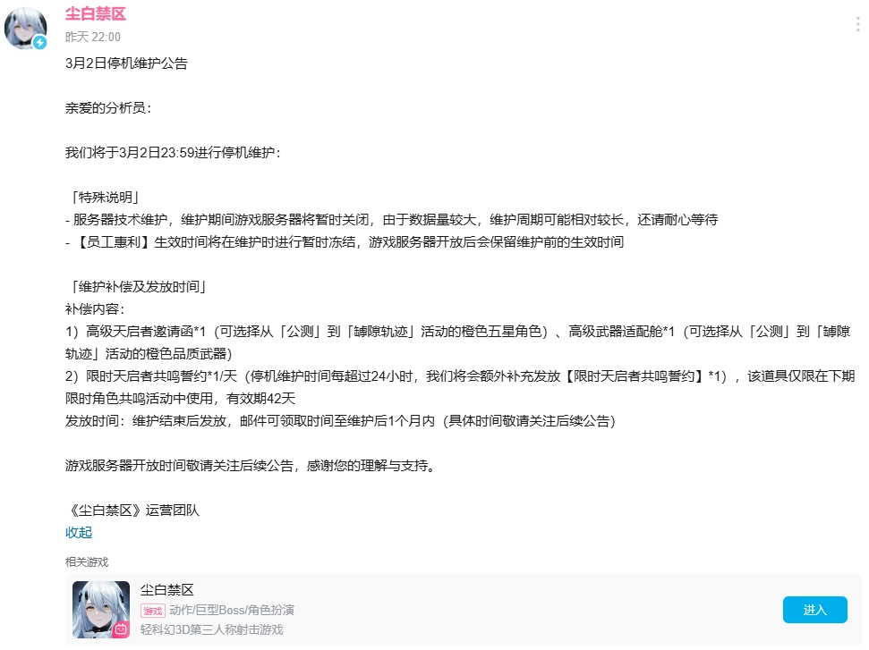 就在今天(3月3日),《尘白禁区》官方发布公告,宣布游戏将开启无期限停服,具体开服时间暂未确定。这一消息迅速引发了众多玩家的关注。根据小编收集到的信息,已梳理出游戏停服的原因,接下来就为大家详细说明。