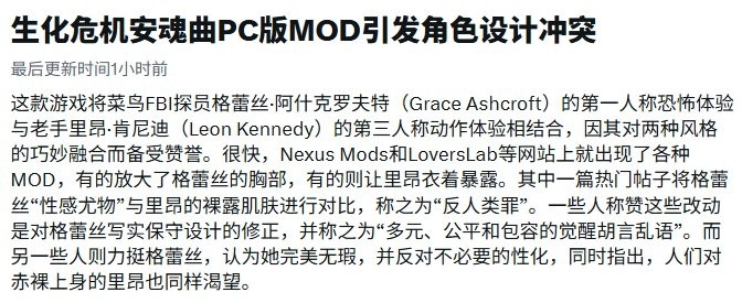 《生化危机:安魂曲》发售没几天,游戏爱好者就做出了今年最具争议的mod之一。这个名为“格蕾丝胸部增大”的mod很快火了起来,还登上了国外社交媒体的热搜,甚至到发稿时仍在讨论榜前列。