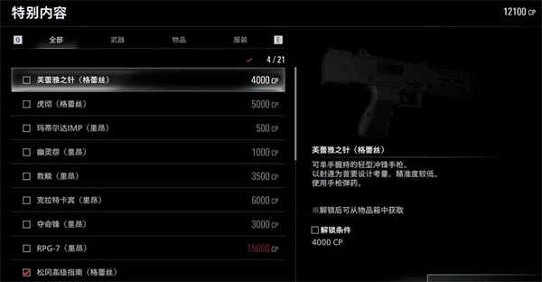 建议优先把CP点数用在战斗难度较高的格蕾丝篇,比如兑换【无限耐久小刀-虎彻】或者前期用起来比较顺手的【芙蕾雅之针】,还有能显著降低攻略难度的【无限弹药(枪械)】和【无限弹药(RPG-7)】。【无限耐久斧头】的性价比不算高,要是CP点数不太充足,不建议优先解锁。