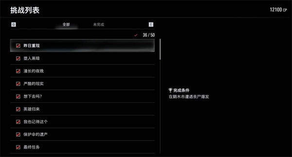※挑战的完成情况对所有存档都通用,每个挑战仅能完成一次,已完成的挑战无法在其他存档里重复完成。这意味着完成同一个挑战只能获取一次CP点数,重复完成不会再得到CP点数。不过,累计类的挑战可以通过多次存读档来积累进度。