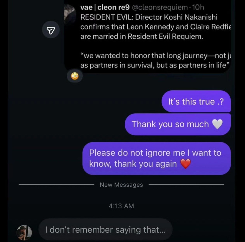此外,还有玩家提到网络上存在另一种观点,认为里昂手上的戒指可能是“家族信物”或“浣熊市幸存者纪念物”,而非婚戒。对此提问中,中西晃史表示,《生化危机9:安魂曲》并未在剧情中对该细节作出明确说明,并补充称:“如果这让你感到困惑或担忧,我道歉。”