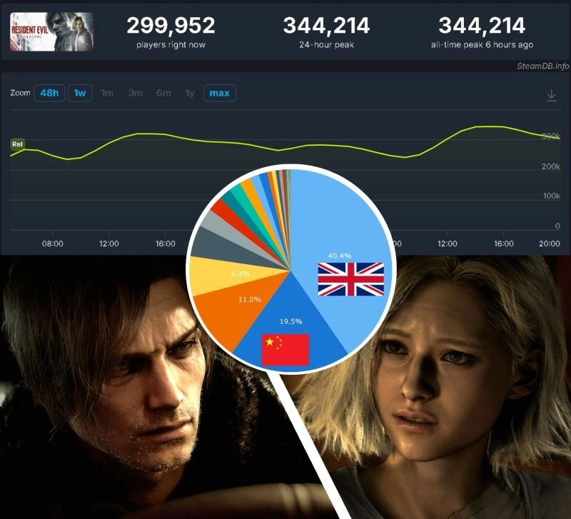 行业分析师Christopher Anjos对Steam用户评论的语言分布等样本数据进行分析后估算,约有20%的玩家或许来自中国。他在LinkedIn上发布帖子表示,这一比例和中国市场的三大趋势十分契合:一是《生化危机》IP热度不断上升,特别是《生化危机4 重制版》推出后吸引了众多新粉丝;二是Steam/PC平台在过去五年里在中国实现了大幅扩张,如今已成为高质量付费单机游戏的主要平台;三是中国付费玩家群体增长迅速,越来越多的用户愿意为优质游戏作品支付全价。