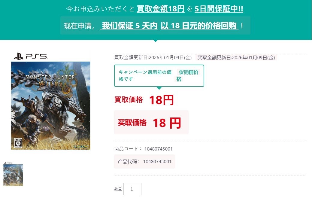 尽管卡普空不断推出更新来优化《怪物猎人:荒野》的游戏体验,然而该作由于内容量比不上前作、性能问题频繁出现(特别是PC版本),市场表现一直不太理想。最近,日本二手回收店铺“Kaitori World”对该作PS5版的回收价格已经低到18日元(大概相当于人民币0.80元),这反映出游戏在日本本地市场面临的严峻状况。