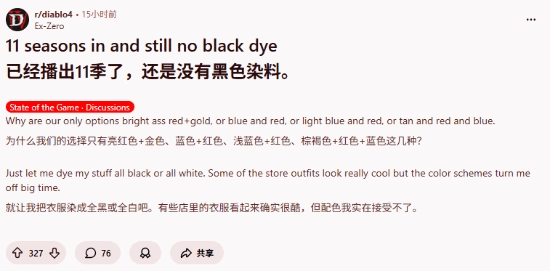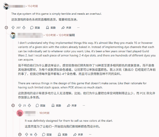 不少玩家也借此机会指出了染色系统本身存在的诸多问题。有玩家直言该系统“糟糕透顶,急需重做”;还有人提到武器和盾牌无法染色,使得角色外观与装备时常出现严重不协调的情况。说到底,外观定制是玩家进行自我表达的一种方式,当他们没办法按照自己的想法塑造角色时,自然会感到失望,尤其是在这对很多人而言都属于游戏核心体验一部分的情况下。