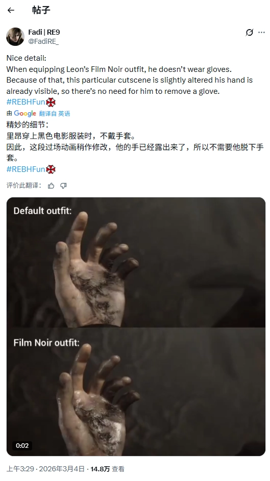 该玩家提到,在给里昂·S·肯尼迪挑选“黑色电影”主题服装时,这个角色默认状态下是不戴手套的。所以,在与之对应的某段特定过场动画里,原本有“摘手套”动作的情节会做些小改动——因为角色双手本来就是裸露的,动画里就不再有摘手套的动作了,这样能让表现更连贯。
