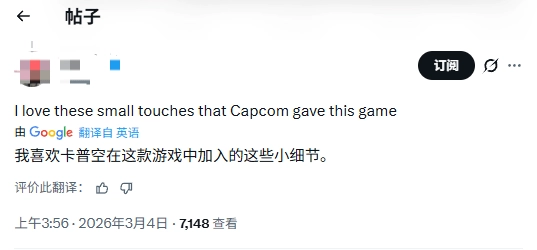 在评论区里,有玩家这样称赞:“卡普空在这款游戏里设计的这些小细节,我特别喜欢。”