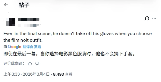 也有玩家补充说:“哪怕是在最后一幕,你选择电影黑色服装时,他依旧不会把手套摘下来。”