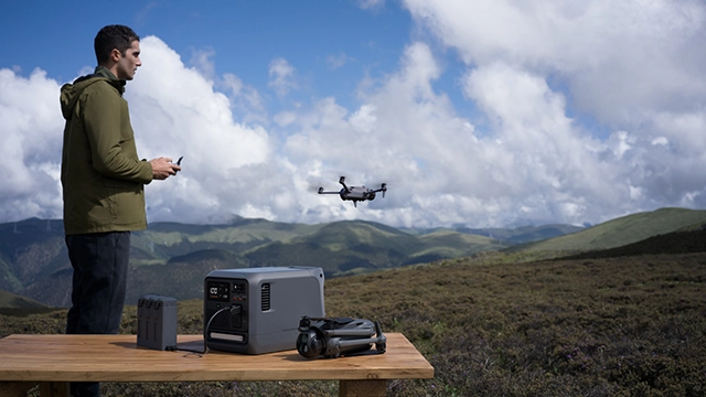 此外,DJI Power 1000 Mini 只要搭配 DJI Power 无人机快充线,就能为 DJI 的部分无人机电池实现 DJI Power SDC 超级快充。以 Air 3 系列为例,电池电量从 10% 充到 95% 仅需 30 分钟[1]。而三块无人机电池与 DJI Power 1000 Mini 组合使用,能够大幅提升航拍效率。