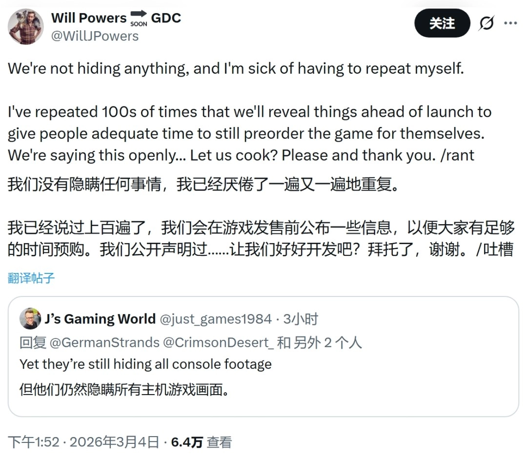 面对不断发酵的舆论,Pearl Abyss的公关与营销总监Will Powers终于忍不住在社交媒体上公开回应:“我们没有隐瞒任何信息,我已经厌烦了重复这句话。我已经说过无数次,会在游戏发售前公布相关内容,让玩家有足够时间自主预购。我们都讲得这么清楚了……能不能让我们专心做游戏?拜托了,谢谢。”
