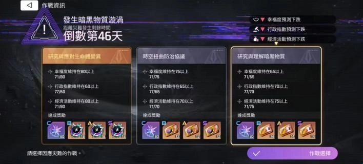 每个周期结束后,我们都会面临为下一个周期从三个选项中择一的选择,这将决定我们在下一周期结束时能获取到何种奖励。在此建议不必关注该作战的稀有度,选择优先级可参考以下顺序: