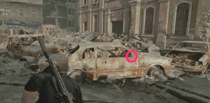 在警察局停车场的报废车辆周边。去停车场得先走出警察局,再沿着外围道路过去。