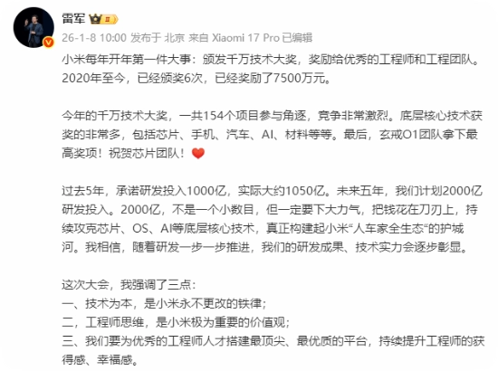 据了解,1月7日小米举行了2025年度技术大奖的颁奖典礼,玄戒O1、2200MPa小米超强钢以及小米智能康镜创新架构分别荣获前三名,而玄戒O1更是拿下了“千万技术大奖”。
